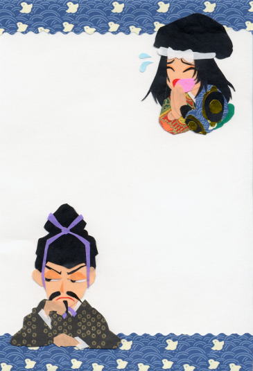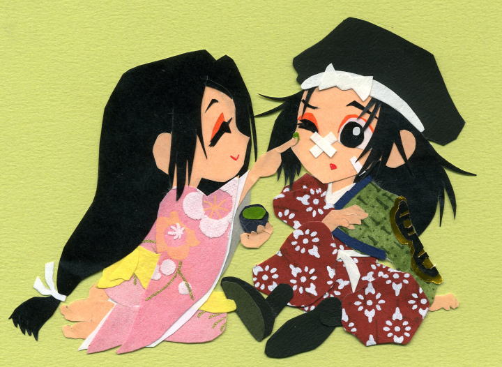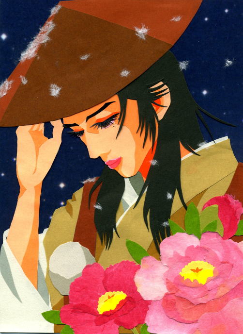 初挑戦のリアル版切り絵。 リアル絵はごまかしが効かないのが ツライところ… 一応「静の舞」がモチーフです。 義経、静、そして頼朝… 離れ離れになりながら、 なお断ち切れぬ愛憎の呪縛。 |