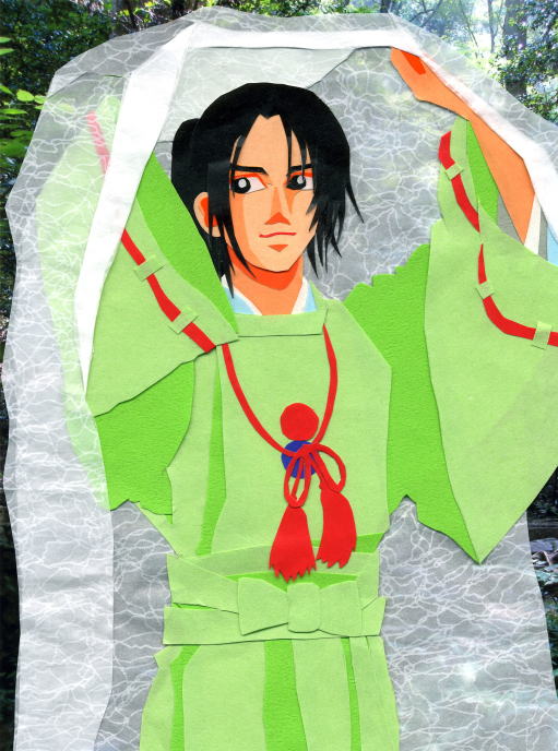 戦闘時の真っ赤な鎧兜、 平時のさわやかな青い直垂、 汚れなき心を現す純白の狩衣… 滝沢義経を彩るさまざまなカラーの なかでもインパクトが強かったのは、 遮那王時代の緑の水干でしょう。 最初こそ「派手!」と思いましたが、 義経のみずみずしい若さ、 草木のような健やかさを象徴する いい色だ…と今では思えます。 |