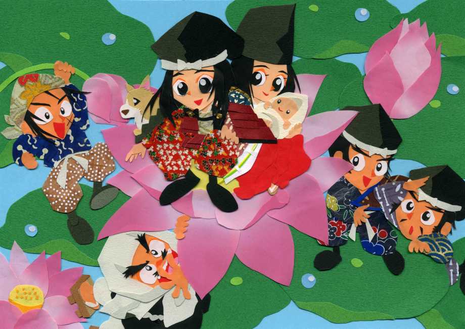 運命共同体という意味合いで 使われることの多い「一蓮托生」、 その言葉の本来の意味は、 あの世の同じ蓮の上でめぐり合い、 皆で仲良く暮らすという仏教用語です。 来世の契りを交わし合った主従、 仲睦まじい恋人、親子、そしてわんこ… (犬吠崎には主を待ち続けて岩になった 義経の飼い犬「犬若」の伝説がある) 彼らが大きな蓮の上に集まって ほのぼのと、あるいはドタバタと(笑) 幸せに暮らしてるといいなあ… |
