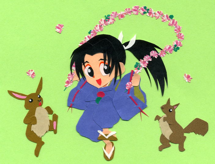 古来から日本人に こよなく愛される花、桜。 華やかに咲き、潔く散る。 その姿に義経の生きざまが 重なってみえます。 ことに滝沢義経には、 桜の花がよく似合います。 でも私の切り絵などでは(以下略)。 |