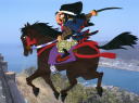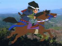 大河「義経」佐藤継信追悼トップ絵。 義経餞の名馬・大夫黒に跨り、 屋島の空を駆ける継信… (背景写真のヘボさはご勘弁) 彼は死した後も天上から 義経主従を見守ってくれてるはず…。 |