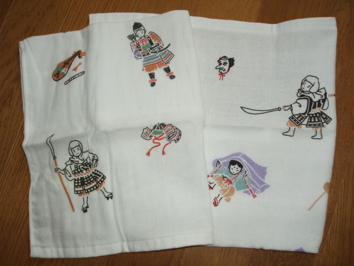 (義経と弁慶/牛若と弁慶) 08年T.S様より頂きました (ありがとうございます!) 牛若&弁慶、義経&弁慶の 素朴な絵柄が何とも愛らしい、 “和”の手ぬぐいタオル。 優しいガーゼの肌触りが魅力です。 (もったいなくて使えませんが) |