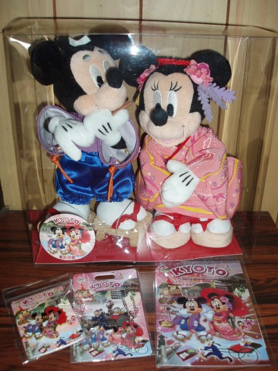 京都限定ミッキー&ミニー (二体セットで¥4980) (08年京都高島屋で購入) 全国高島屋で限定発売されている ご当地ミッキーシリーズの 京都ヴァージョン・牛若ミッキー! ミニーは静御前…ではなくて 舞妓さんですが、 同じ舞を生業とする白拍子・静の 転生した姿だと思うことにします(笑) ほかにもポストカードやピンバッジ、 タオルやパイなどグッズ各種あり。 |