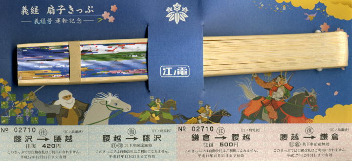 江ノ電義経号運転記念 義経扇子きっぷ 発売元:江ノ島電鉄(江ノ電) (05年旅行代理店より購入) 江ノ電ラッピング電車「義経号」の 特別乗車券。 買ったはいいけど 結局運行期間中(05年)に 鎌倉には行けずじまい… どっちにしてももったいなくて 使えませんけどね。 |