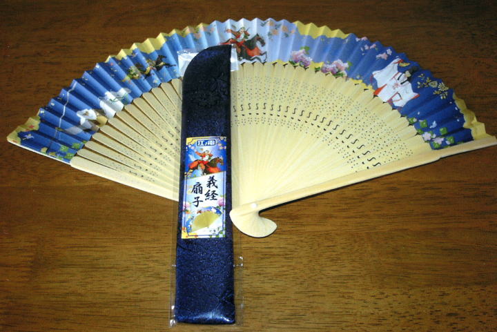 江ノ電義経扇子「動」 (¥800) 発売元江ノ電オフィシャルサイト (05年ネットで購入) そしてこちらが鎧兜に身を固め 颯爽と駆ける「動」の義経様。 両サイドには 優雅に舞う静御前と 薙刀をふるう勇ましい弁慶の姿が 主を守るように描かれてます。 |