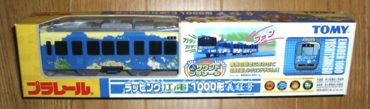トミカ・プラレール 江ノ電1000系義経号 (¥2500) 発売・製造元TOMYプラレール (05年ネットで購入) 同じくトミカのプラレール、 江ノ電のラッピング電車「義経号」! 限定3000個のレアものです。 さわやかなブルーの車体に、 義経や静、弁慶らの勇姿が 生き生きと描かれています。 |