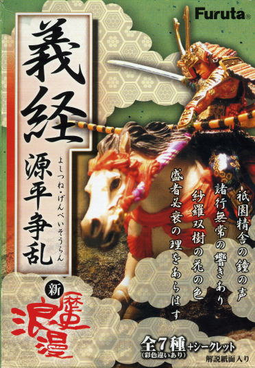 新歴史浪漫・義経源平争乱(フルタ)(¥300) フルタ公式HP 1平重盛(平治の乱) 2源頼朝(石橋山の戦い) 3平清盛(富士川の戦い) 4源義経(一ノ谷の戦い) 5那須与一(屋島の戦い) 6能登之守教経(壇ノ浦の戦い) 7武蔵坊弁慶(衣川の戦い) シークレット・宇治川の戦い ※2005年発売 源平のドラマティックなワンシーンをフィギュアで再現! 源義経と那須与一はかっこいい騎馬武者姿。 ほかのフィギュアに比べると倍ほどのサイズです。 (白毛・栗毛など色違いデザインもあり) 細部まで精巧に造られていて、並べて飾ると実に壮観! |