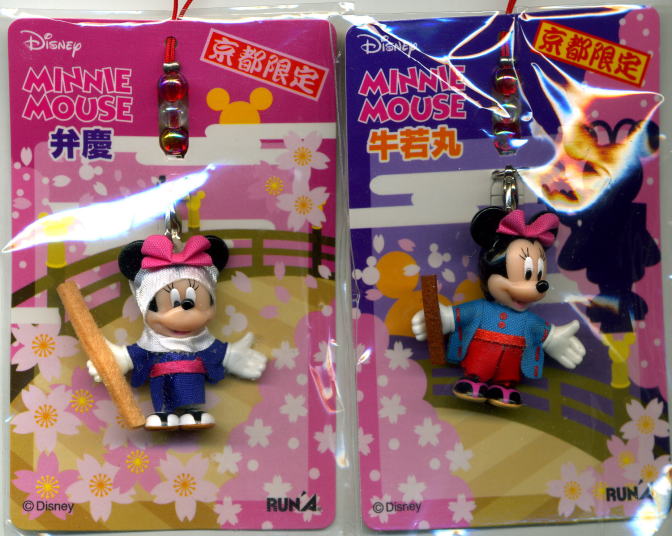 牛若丸・弁慶根付(各¥525) 発売元:株式会社ラナ (07年京都駅お土産店で購入) 左記のディズニーオンツアー シリーズに引き続き、 ミニーのご当地グッズ登場! 牛若ミニーは牛若丸というよりは 卒業式の女子大生。 弁慶ミニーが持ってる薙刀は 芋けんぴ(私の大好物)に見えます。 |