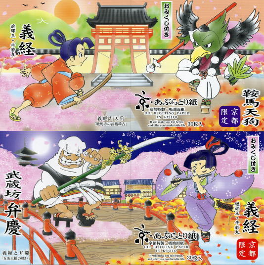 京・あぶらとり紙 義経と天狗/義経と弁慶(¥630) 05年京都駅ビルで購入 京都土産といえば八つ橋ですが 女性向けにはあぶらとり紙が定番。 義経ヴァージョンもついにお目見え! お土産物としてはめずらしい マンガタッチの絵柄がかわいい。 |