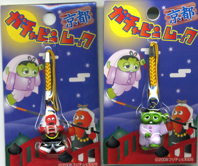 京都ガチャピンムック 根付 牛若/弁慶(各¥450) 06年京都駅ビルで購入 これはまたとんでもないのが 出てきました。 ガチャピンてアンタ。 何でもやりゃあいいって もんじゃないぞ! …と一応ツッ込ませて頂きますが、 私、こういうキワモノ大好きです。 |