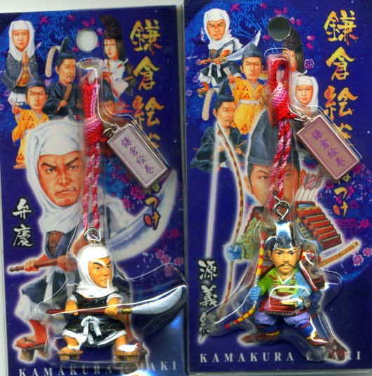 鎌倉絵巻・根付 義経/弁慶(各¥525) (07年京都駅お土産店で購入) 力強いポージングにリアルな表情 (めずらしくお髭姿の義経様)、 細部まで丁寧につくられた 根付シリーズ「鎌倉絵巻」! でも買ったのは京都のお土産店。 当の鎌倉では売ってるのかな? 売ってなかったら笑えます。 |