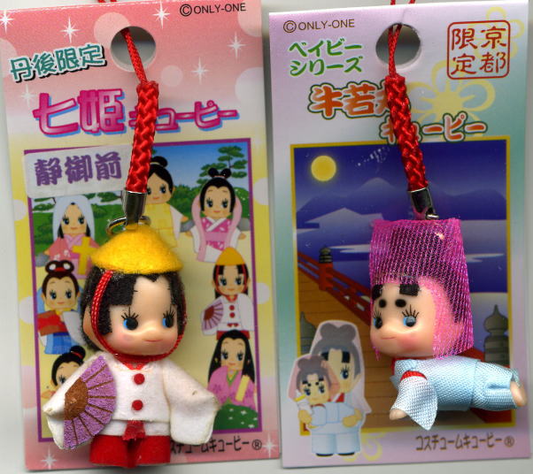 京都/丹後限定キューピー根付 静御前/ベイビー牛若丸(各¥420) 08年ネット等で購入 ハイハイポーズが可愛い ベイビーシリーズ牛若キューピーと、 丹後地方ゆかりの女性達「七姫」の 一員、静御前のキューピー。 (※丹後には静出生伝説がある) 静キューピー、白拍子スタイルが とてもよく似合ってて可憐です。 |