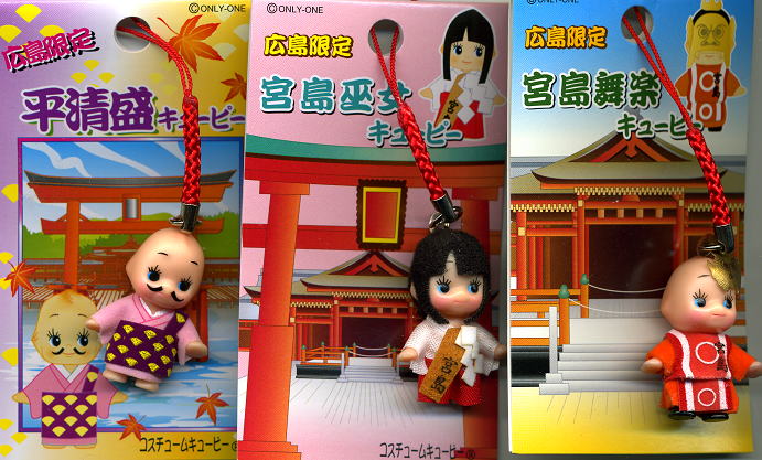 広島限定キューピー根付 平清盛/巫女/舞楽(各¥420) 08年宮島売店で購入 平清盛キューピー出現! かわいくなっちゃってまあ…。 巫女さんキューピーも 静っぽくて可愛いので購入。 舞楽キューピーは大河「義経」の オープニングを思い起こさせます。 優しい美貌を恐ろしい仮面で隠し 戦ったという舞楽“蘭陵王”は まさに滝沢義経のイメージ。 |