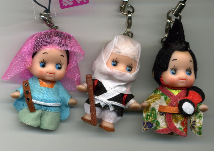 (株)となりのみよちゃん・QP共和国牛若丸/弁慶/静御前 (各¥580) 06年ネットショップで購入 またまたキューピーちゃん! 定番コンビ(義経弁慶)に 静御前が加わって華やかです。 実はみんなおんなじ顔なのに、 三者三様のかわいらしさが ありますね。 |