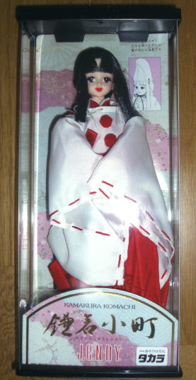 鎌倉小町 ジェニー(静御前イメージ) (¥9450) 発売元おもちゃのちょっぺ〜 製造元(株)タカラ (05年ネットで購入) 女の子達の憧れジェニー人形の 静御前バージョンが登場! 烏帽子や太刀、扇子といった 白拍子アイテムもついて本格的。 ひとりぼっちじゃ可哀想なので ぜひボーイフレンドの「義経くん」も つくってください。 |