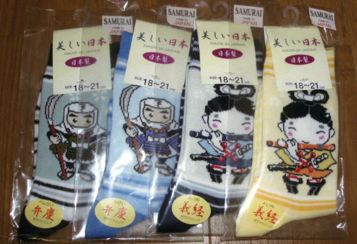 子ども用ソックス 義経/弁慶(各¥300) 発売元伊賀流忍者店 06年ネットで購入 ニッコリ笑顔がキュートな牛若と、 つぶらな瞳のなごみ系弁慶。 かわいい〜〜! もったいなくて履けません。 そもそもジュニア用だし。 |