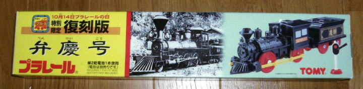 トミカ・プラレール 弁慶号 (¥3150) 製造元TOMYプラレール (06年ネットで購入) 98年10月14日プラレールの日に 特別限定復刻版として発売された 超レア・プラレール「弁慶号」。 左記の「義経号」同様、 明治時代の北海道で活躍した 機関車がモデルです。 電車になっても仲良し主従! |