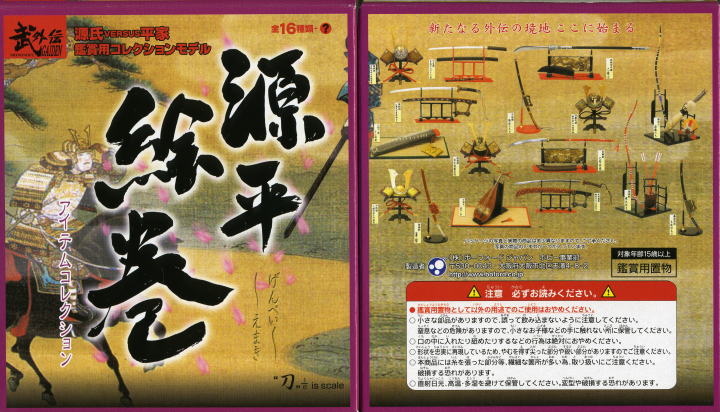 武外伝・源平絵巻(ボーフォードジャパン)※食玩ではありません (兜)源義経・赤糸縅厳星兜/源頼朝・長鍬形前立付厳星兜/平清盛/斎藤実盛 (太刀)源義経・薄緑/源頼朝・沃懸地杏葉螺鈿太刀/平忠盛・黒拵の太刀&小枝/平清盛/藤原景清/木曽義仲 (薙刀)武蔵坊弁慶・大薙刀/巴御前・巴形長巻 (弓)源義経・源氏伏弓/那須与一・滋藤の弓 (楽器)静御前・十三弦琴/平経正・青山※琵琶 (シークレット)源義経・赤糸縅鎧大袖付 ※2005年発売 源平両雄ゆかりの武具が6分の1サイズの観賞用コレクションモデルとして登場! 兜に太刀、薙刀、弓、楽器など16アイテム+シークレットがそろっており、 どれもこれもそれはそれは美しく精巧な仕上がりでほれぼれします。 シークレットは義経の赤糸威の鎧!大河「義経」でタッキー義経も着用してたあのカッコイイ真っ赤な鎧です。 |