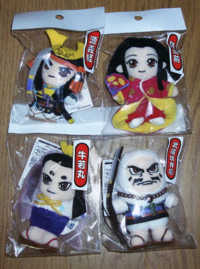 「義経」マスコットストラップ 義経/牛若丸/弁慶/静御前 (各¥880) 発売元キャラシンクHP (05年ネットで購入) 義経、牛若丸、弁慶、静… 個性豊かな表情が 何とも愛くるしいマスコット。 写真のストラップタイプのほかに、 ぬいぐるみ・キーチェーンタイプもあり。 |