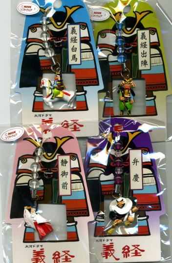 「義経」ビーズストラップ 義経白馬/義経出陣/静御前/弁慶 (各¥483) 発売元株式会社トーシンパック ※「義経」コーナー (06年ネット通販で購入) 「義経」キャラのキュートなストラップ。 色違いのビーズストラップも、 鎧をかたどった台紙もかわいい! 同デザインで根付や耳かき、 ミニからくり人形なんかもあります。 |