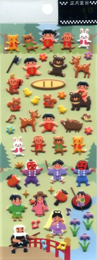 金太郎&牛若丸&一寸法師 10年地元文具店で購入 金太郎と牛若丸と一寸法師の世界が 絶妙にコラボってる楽しいシール。 五条大橋の川上からは 一寸法師がお椀の舟でやってくるし、 天狗の修行の真っ最中の牛若は お隣の金太郎の土俵に乱入しそう。 わらわら群れてる動物たちの キュートさもたまりません。 |