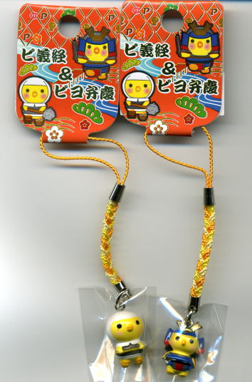 ピヨシリーズ根付 義経/ピヨ弁慶(各¥320) 05年岩手「えさし藤原の郷」で購入 (全国義経ゆかりの地で販売) 巷で人気の「ピヨ」シリーズ。 ひよこ化が違和感なくハマる カワイイ歴史人物なんて、 この人たちぐらいかも…。 |