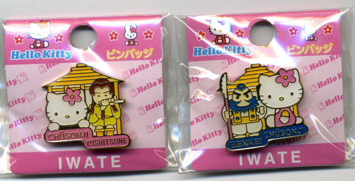 中尊寺キティピンバッヂ 義経/弁慶各(¥420) 05年岩手中尊寺売店で購入 中尊寺金色堂を背景に、 キティと牛若/弁慶が ツーショット!(記念撮影?) |