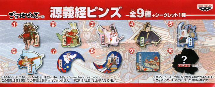 源義経ピンズ 全9種類+シークレット (各¥100) 発売元ご当地ピンズ (05年全種類ゲット) 京都、岩手平泉、下関など、 義経ゆかりの地の売店に置いてる 源平キャラのレアなピンズ。 気になるシークレットは、 幼少期の牛若がお世話になった 鞍馬在住?のあの御方ですよー。 |