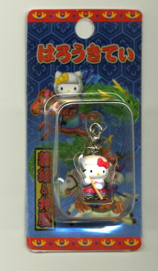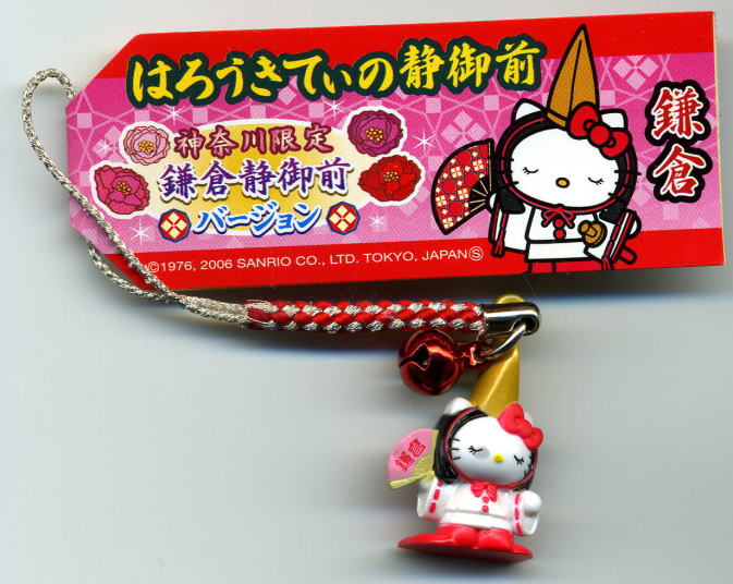 根付(¥420) 07年ネットショップで購入 (鎌倉近辺で販売) ご当地キティシリーズに、 満を持して静御前登場! 衣装や髪型、表情など、 静らしさがよく表れたデザインで、 とてもキュートです。 |