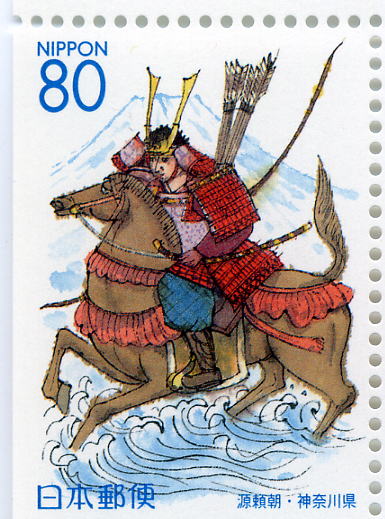 80円切手「源頼朝」 04年通販で購入 1999年に発行された 神奈川県の「ふるさと切手」です。 富士山に真紅の鎧がよく映える。 まさしく大将の貫禄です。 武士・源頼朝の面目躍如! …ホントは戦は苦手なんだけど… なんてことは言いっこナシで。 |