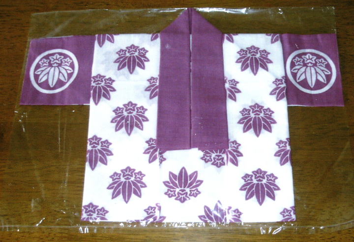 豆半纏(おにはっぴ) 笹竜胆 (¥600) 05年「義経展」 (兵庫県立歴史博物館)で購入 源氏の家紋・笹竜胆の柄! もったいなくて使えません。 (元通りに畳める自信がないので うかつに広げることもできません) |