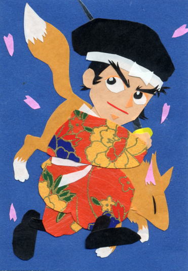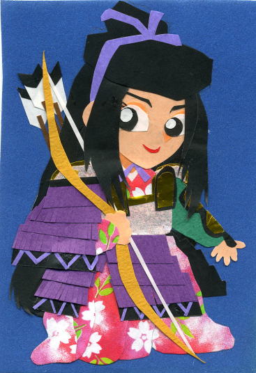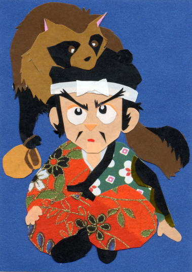 屋島に散った陸奥の武士 享年28(1158〜1185) 秀郷流藤原氏・陸奥国信夫荘司佐藤元治の子(藤原秀衡の弟忠継の子という説も?) 母:乙和(和泉十郎藤原清綱女/秀衝のいとこ) 通称:三郎兵衛尉 九郎義経とは少年期(義経が奥州に逃れてきた頃)からの仲良し。頼朝旗揚げに際し、藤原秀衡の命を受け弟忠信とともに義経の供として東国に赴いた。屋島合戦にて平教経の強弓から義経を盾となって守り落命した。義経は嘆き悲しみ戦を早々に切り上げて近くの寺で継信を厚く弔った。「平治物語」によると継信は豪放磊落な性分で、酒が入ると語気荒くなったという。…ちなみに切り絵の狸は、屋島合戦の一部始終を見ていた四国狸の御大将、屋島太三郎禿狸のつもり。 |