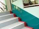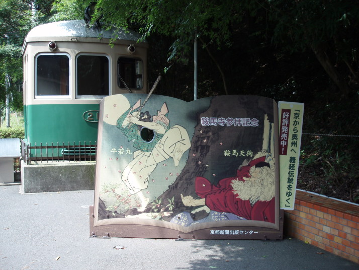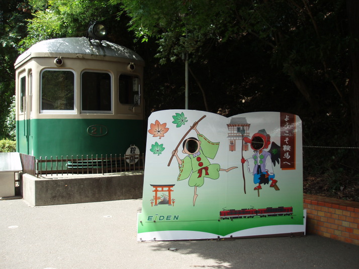 鞍馬寺EIDENパネル2005年版(上)2006年版(下) 駅舎の横には、観光地の定番・記念写真用顔出しパネルが設置されています。05年は有名な浮世絵の牛若と大天狗の修行シーンでしたが、06年には叡電オリジナルデザインの牛若&天狗ツーショットに替わっていました。こちらのほうがよりキュートで子供も喜びそう。ふたり用なのもうれしいですね。でもどっちが牛若になるかでモメるかな!? |
