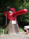 叡山電鉄鞍馬寺駅・天狗がお出迎え 叡山電鉄・鞍馬駅の駅舎を出るといきなり大天狗がお出迎え。「お…怒ってます?」と問いかけたくなるような真っ赤な仏頂面。でももともとこういうキャラだから大丈夫。見た目は怖いけどきっと本当はいい人です。(※人じゃない) |