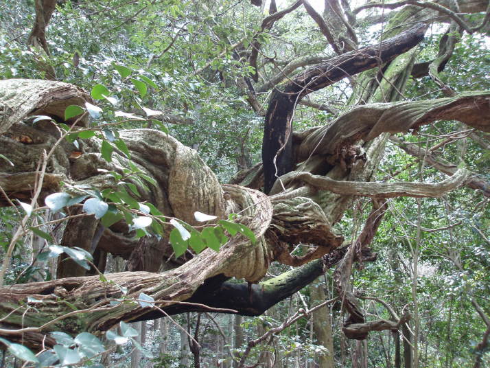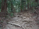 木の根道・木の芸術 鞍馬名物・木の根道。網目のように地を這う木の根はまさに圧巻。のみならず、地上の木々も驚くほど個性的な姿をみせてくれています。下の写真の木など、何本の木がいったいどうからまっているのかさっぱりわかりません。これも鞍馬の魔王様のなせる業か…?なみなみならぬ木々の生命力、情念すら感じます。 |