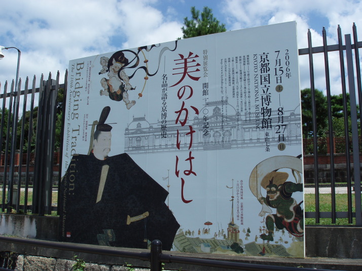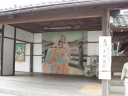 「美のかけはし」パネル 博物館周辺には左の写真のような大きなパネルが展示されており、道路からでも頼朝様のご尊顔が目を引きます。 しかし実物の肖像画はやはり格別!何ともいえないリアルな存在感があり、それほど巨大な絵でもないのに威圧感を覚えました。この肖像画は05年姫路「義経展」でも展示されていたのですが、私が訪れた時はちょうど入れ替えで見られなかったので、「やっとお会いできました兄上〜!」と感慨もひとしお。 実はこの像、頼朝じゃない説が濃厚なんですよね。でももうすでにイメージが定着しちゃってるから、きっと今後もこの美しいお顔が頼朝の公式画像として使われ続けることでしょう。いいなあ…それにくらべて義経なんて…義経なんてぇ〜!(泣)実物と似てるという確証も何もない、何百年も後に描かれたあの貧弱な絵(義経ファンならお分かりのはず)が肖像画扱いされてるんだぞ〜!この際あれはもうなかったことにして、かわりに滝沢義経を義経の正しい顔として後世に伝えてゆきたいです。(←マジ) ついでに(ついでかよ)後白河法皇像も見ることができました。こちらはザ・たぬきおやじ!という感じで、威厳はあるのだけどどこかホニャララとすっとぼけ、それでいてしたたかなお顔をしていらっしゃって、なかなかに引き込まれます。 |