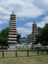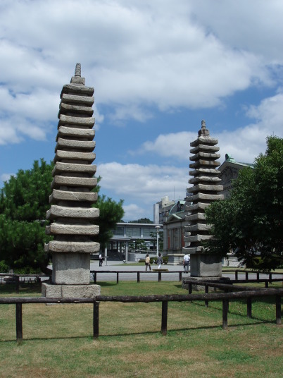 佐藤継信・忠信石碑 博物館の敷地内には、ひときわ目を引くツイン石塔(高さ約6メートル)が建っています。義経の忠臣・佐藤兄弟の慰霊塔と伝えられている石塔で、もとはこの近所の馬町にあったものが移動されてきたのだとか。その馬町の跡地にも佐藤兄弟をしのぶ石碑が残されているそうです。そこにも足を伸ばそうと思ったのですが…すいませんもう歩けません…また次回ということで…(鞍馬山ですべての力を使い果たした) |