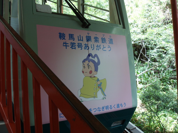 仁王門と本殿をつなぐ鞍馬ケーブルは「牛若号」と名づけられ、ごらんのように車体には可愛いイラストが描かれてます。ただ、以前まであった牛若絵入りチケットは廃止されたもよう…(「成功してもおごらず・失敗してもくじけず」等のありがたいお言葉が記された無地のチケットに替わってた)牛若チケット、可愛かったのに〜!どうか復活させてほしいです。義経ファンの皆様、ケーブルに乗る際にはぜひ係の人に「牛若の絵入りチケットないんですか〜?残念〜集めてたのにな〜可愛かったのにな〜」とさりげなくアピールしてみましょう。ひとりひとりの力がいずれ実を結ぶ…はず(笑)