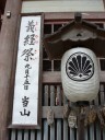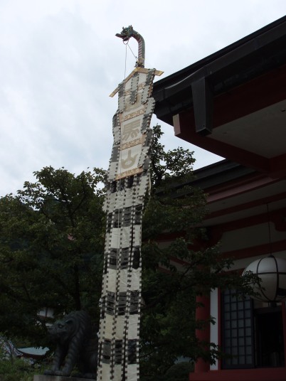 本殿正面の中央柱にも「義経祭」の文字、そして左右の狛犬(狛トラ?)のそばには、竜頭のついた豪奢なのぼり旗がなびいています。(写真が暗くて申し訳ない)