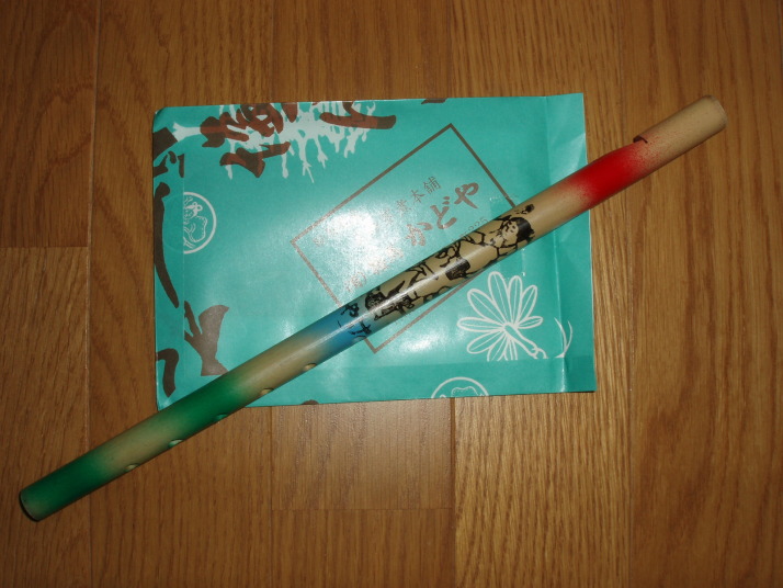 油とり紙(¥500)叡山電鉄鞍馬駅から歩いてすぐのお土産物屋さん「かどや」で販売している、牛若丸の浮世絵の絵はがき、そして油とり紙。これで牛若丸のようにみずみずしい肌に…!なれたらいいですよねえ(遠い目)。 笛(¥220) 同じく「かどや」にて販売している竹笛。横笛タイプと縦笛タイプの二種類あります。いずれも牛若VS弁慶(五条大橋)のイラスト入り!