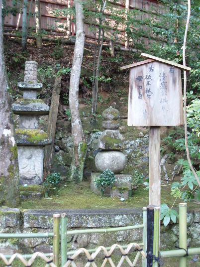 祇王寺・平清盛供養塔と祇王らの合同墓 祇王寺の境内には、祇王姉妹と母そして仏御前の合同墓といわれる三重塔が建てられています。そしてその隣には清盛の供養塔も。自分が捨てた女達の真横に立たされ、清盛はどんな気持でいるのやら。(笑) |