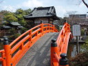 神泉苑 次は洛中、二条城そばにある静御前ゆかりの「神泉苑」へ。平安京造営の際に設けられた苑地で、清らかな泉がこんこんと湧き出すことから神泉苑と名づけられました。天皇や貴族らの遊宴の池であり、また雨乞いや怨霊封じが行われる特別な場所でもありました。 後白河法皇が白拍子を集めて雨乞いの儀式を執り行った際、百人目の静御前が舞い始めるとみごと雨が降り出したため、法皇より「日本一の白拍子」と称えられたそうです。また一説にはここが義経と静御前の馴れ初めの場所ともいわれています。美しい水辺で出会った運命のふたり…希代の英雄と絶世の美少女の出会いにふさわしい、いかにもロマンチックなシチュエーションですね。 当時の神泉苑は広大な公園でしたが、二条城築城の際に大部分が壊されてしまい、現在は放生池がわずかに残るのみ。その池には、鮮やかな朱の欄干の橋が渡されています。この橋を願い事を一心に念じて渡ると願いがかなうのだそう。私が訪れた際にも、若いカップルがキャッキャと手をつないで渡るほほえましい姿が見られました。 境内自由 |