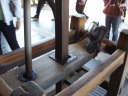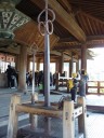 清水寺・弁慶の鉄杖と鉄下駄 有名な清水の舞台に向かう通路の途中には、弁慶が使った?といわれる大小の鉄杖と鉄下駄が設置されています。大きい鉄杖は90kg、鉄下駄は12kgもあるそう。実はこれらは江戸時代に参拝者が奉納したもので弁慶とは本来何の関係もないものですが、これを怪力の僧兵が持ってたらサマになるだろうな〜…という妄想から、勝手に弁慶のアイテムにされたのでしょう。まあ弁慶にまつわる史跡なんてどれもだいたいコジツケですからね。弁慶がいかに時代を越えた人気者であるかということの証でもありましょう。 ちなみに男性は鉄杖を、女性は鉄下駄を持ち上げられれば無病息災!!…らしい。(そのへんにいたツアーコンダクターの人談)というわけで小学生からお年寄りまでキャッキャキャッキャとにぎやかに群がって、めいめいにトライしてました。その合間をぬってすかさず写真を撮ったので下の鉄下駄の写真など大いにブレてて我ながら笑えます。 |