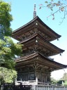 清水寺・子安の塔 京都観光のランドマーク・清水寺にも常盤ゆかりの史跡があります。清水の舞台の本堂からさらに奥の高台に建っている子安塔です。子等を連れて平家の追手から逃れる常盤御前はこの塔に立ち寄り、御堂の子安観音に子等の無事を一心に祈願したといいます。常盤にまつわる史跡は、いずれも子を思うひたむきな母心がしのばれるものばかりで、泣かせます。 このあと常盤は雪の降る中、子等の手を引き幼い牛若を胸に抱き、伏見街道を南下して知己のいる奈良・宇陀の里へと逃げ延びてゆきました。 清水寺拝観時間/6:00〜18:00 拝観料/¥300 |