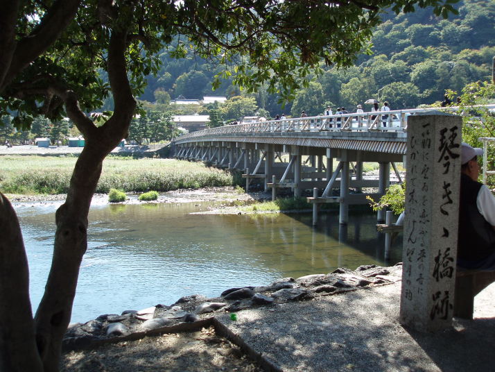 渡月橋(琴きき橋) 小督の奏でる琴の音を聴いた高倉天皇の使者・源仲国は小督の居場所を探し当て、小督はふたたび御所に呼び戻されますが、またもや清盛の怒りに触れ、無理矢理尼にされて隠棲の身となってしまいます。最愛の人を奪われた高倉天皇は失意のうちに21の若さで崩御し、その御陵は小督の出家した洛東の清閑寺のそばに造られました。 嵯峨観光のメインスポット・渡月橋は、仲国が小督の琴の音を聴いた場所といわれ、そのたもとに「琴きき橋」の碑が建てられています。ほかにも小督塚・小督の経塚(法輪寺)など、小督にちなむ史跡がこの付近には点在しています。 |