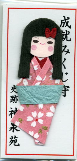 神泉苑・成就みくじ守(恋みくじ)¥300 義経と静の出会いにちなんだおみくじ付きお守り。かわいい紙人形は柄違いでいろんな種類があります。おみくじは愛情運や縁談のアドバイスのほか、相性のいい星座や血液型なんかも書かれていて、若い女の子向けのポップな内容になってます。 |