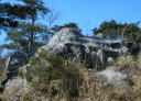 鵯越遊園墓地・蛙岩 高尾山からさらに南へ、めげずに延々歩いてゆくと、次なる史跡「蛙岩」。車道脇からひっそりと伸びている山道(わかりにくい)を数十メートル進むと、なるほどガマガエルか何かがうずくまったような巨石がどっしりと鎮座しております。が、付近にはこれについての説明看板など何もなし。神戸市北区HPのハイキングコース案内によれば「ここで義経は兵を二分した」ということなのですが…。でもこの岩場もなかなかのビュースポット。九郎もこの岩の上に立ち、眼下に広がる神戸を見下ろして、さていかに攻むるかと思索したのでしょうか。 |