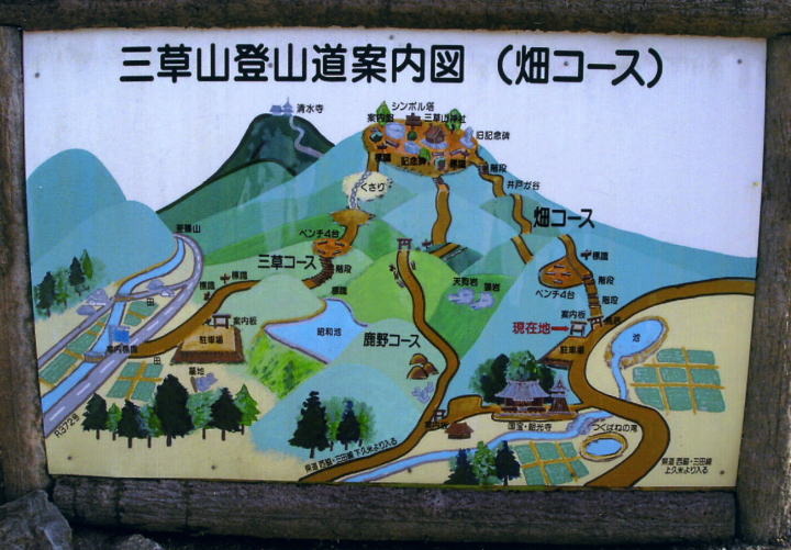 三草山(畑コース登山口) 最短ルート「畑コース」は三草山の南側から登る1.5キロほどの距離、ゆっくり登っても一時間もかからないので初心者にはおすすめ。ただし距離が短いぶん勾配がきつい!とくに登山口からいきなり延々と続く階段状の急坂には閉口します。でもこれを乗り切ればあとはどうにか…運動不足の私でもけっこう楽しんで登れました。登山道はほどよく整備され、かといって観光客ズレもしておらず、友達や家族連れで気軽に低山登山を楽しむにはうってつけの親しみやすい山です。 |