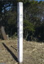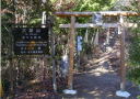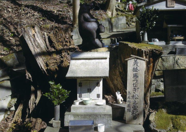 鵯越遊園墓地・義経馬つなぎの松 ハイキングコースは藍那駅から山道、市街地を抜け、鵯越墓園の中を通ってゆきます。園内には整備された車道がありますが、藍那側からの入り口となる北門はお盆とお彼岸の時期しか開放していないので、車を置いて歩かねばなりません。たいへん広大な山上の墓園、けっこう起伏もあり、歩いて突っ切るのはちょっとえらいことでした… 墓園を南北に貫く車道を三分の一ほど進むと、雨量レーダーのそびえる高台があります。そのすぐふもと、高尾地蔵尊のそばに、義経馬つなぎの松という史跡が。なるほど祠の後ろにそれらしき苔むした古い切り株がみえます。 |