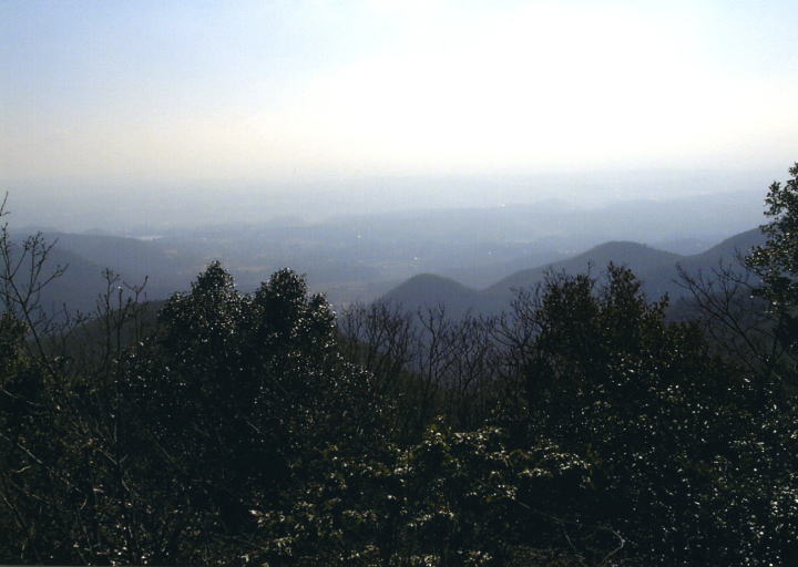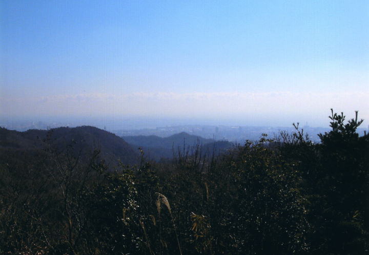 三草山(山頂よりの眺望) 頂上より南の方角を見おろすと、低山が幾重にもうねる播州平野の先に壁のように横たわる六甲連山、南西には淡路島や瀬戸内海、南東にははるか紀伊半島が見えることも…しかしこの時は春先特有の靄がうっすらとかかっていて、六甲山や淡路島などの輪郭がかろうじて見えた程度。写真ではなおさらわかりませんな。でも、九郎が鵯越に向けて進んでいったであろう景色がここから一望できるのは感動もの。確かな地図も情報もない時代、この靄よりもなお漠然とかすんだ先行きへの不安と戦いながら突き進んでいった九郎たちの心の強靭さには感服せずにはおれません。それにしてもこの写真はヒドイや。今度もしもっとクリアな景色が撮れたらUPします…。 |